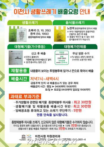 ▲ [쓰레기배출요령/이천시제공]이천시에서는 시민들이 깨끗하고 쾌적한 생활환경 속에서 명절을 즐겁게 보낼 수 있도록 설 연휴기간 동안 쓰레기 불법투기 단속을 실시한다.
