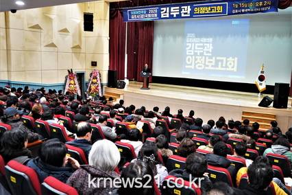 김 의원은 7일 고촌읍·풍무동 의정보고대회를 시작으로 10일 김포본동·장기동 의정보고대회, 15일 사우동 및 종합의정보고대회 등 15일까지 지역구인 김포시갑 소재 3개의 권역별 의정보고회와 지하철역, 김포5일장 등을 중심으로 한 현장 의정보고회를 개최했다. 3개 권역별 의정보고대회에는 추운 날씨에도 불구하고 지역주민 등 약 1,000여 명이 참석했다.