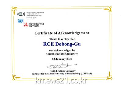 ▲ [이미지제공 = 도봉구]도봉구(구청장 이동진)는 2020년 1월 21에 UN대학에서 선정하는 ‘지속가능발전교육거점도시(Regional Centre of Expertise, RCE)’로 서울시 자치구 최초로 선정 되었다. 국내에서는 6번째 RCE 회원도시가 된다.