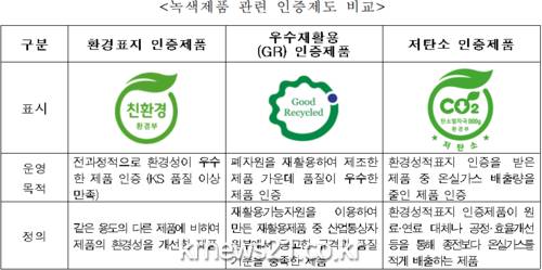 녹색제품은 에너지·자원의 투입과 온실가스 및 오염물질의 발생을 최소화하는 제품으로 '환경표지 인증제품'과 '우수재활용 인증제품'으로 구성되어 있다. 이번 개정법률에 따라 '저탄소 인증제품'도 녹색제품에 포함되는 것이다.