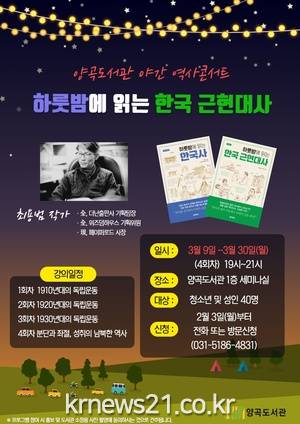 ▲ [사진제공 = 김포시]김포시 양곡도서관은 2020년 김포시 도서관 개관시간 연장운영 계획과 관련해 야간 역사콘서트 ‘하룻밤에 읽는 한국 근현대사로 보는 독립운동이야기’ 강좌를 운영한다.