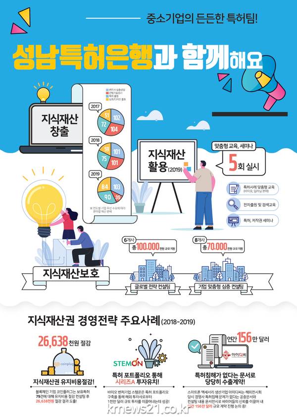 성남시 벤처·스타트업과 중소기업, 시민의 지식재산 허브 기능을 담당하는 성남 특허은행은 지난 2017년 개소 후 매년 300건 이상 직·간접적인 맞춤형 지원 활동을 펼치고 있다.