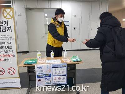 ▲ [출근 시간에 시민들에게 마스크를 나눠주고 있는 김포시청 철도과 직원들의 모습/김포시제공]신종 코로나바이러스 감염증(신종 코로나) 확산 방지를 위해 김포시가 도시철도 김포골드라인 역사에서 신종 코로나바이러스 예방을 위한 2월 7, 10일 이틀에 거쳐 이용객 마스크 착용 캠페인을 벌였다.