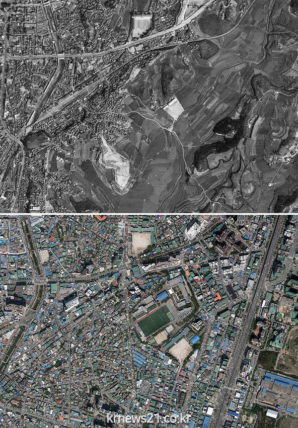 ▲ 1960년대 중반 인계동(위)과 2000년대 초반 인계동 항공사진1950년대 팽나무고개의 유일한 여고생과 탱자나무집 외아들, 3대째 이어진 대성방앗간 안주인 등이 기억하는 수원시 인계동은 어떤 모습일까.