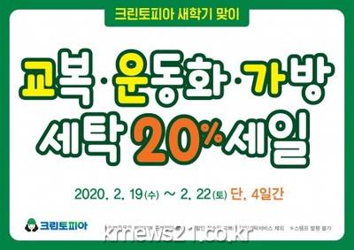 ▲ [사진=홍보포스터]세탁 전문 기업 크린토피아(대표 이범택)가 신학기를 맞아 19일(수)부터 22일(토)까지 4일간 ‘학생용품 세탁 세일’을 진행한다.