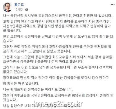 홍 전 대표는 "황교안 대표와의 만남도 취소당하고 이미 끝난 강북출마를 또다시 강요당하고 참 황당한 하루였다"며 "황 대표처럼 전략공천을 바라지도 않는다. 양산 예비후보들과 국민경선이라도 결정해주면 평당원의 입장에서 흔쾌히 받겠다"고 재차 강조했다.