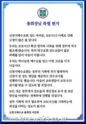 신천지는 25일 새벽 홈페이지에 이만희 총회장의 '특별 편지'를 공개했다. 이 총회장은 “신천지는 정부의 시책에 적극 협력해 전 성도 명단을 제공하고 전수조사를 진행하기로 했다. 교육생들이 코로나19 검사를 받을 수 있도록 하겠다."며 "모든 것은 정부에서 성도들의 개인정보 유지 및 보안 방안을 마련하는 전제 하에 진행할 것”이라고 했다.