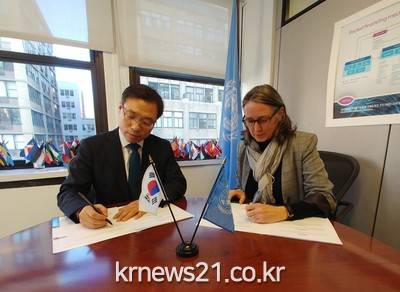▲ [사진제공 = 산림청]산림청(청장 박종호) 최병암 차장은 2.21(금) 오전 10시 뉴욕 유엔개발계획(UNDP) 사무국에서 유엔개발계획(UNDP) 다자신탁기금(Multi Partner Trust Fund, ‘MPTF’)과 아프리카 콩고의 열대우림 보전에 기여하기 위한 업무협약을 체결하였다. 이는 산림청이 2017.1.17 가입한 중앙아프리카 산림이니셔티브(CAFI)의 이행과 노력을 위한 것이다.