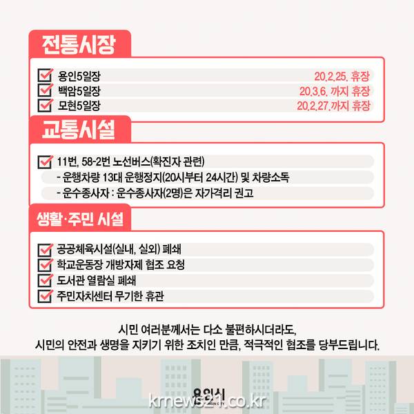 관내 17곳 도서관은 24일부터 열람실 운영을 중단하고, 처인구 김량장동 일원에서 열리는 용인5일 장(25일)과 백암5일 장(26일), 모현5일 장(27일)도 이달 말까지 운영하지 않는다.