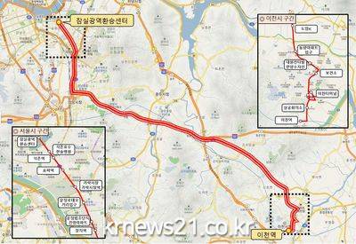 ▲ [노선도/이천시제공]이천시(시장 엄태준)는 다음달 17일부터 이천역에서 잠실광역환승센터를 오가는 경기 급행버스 G2100번이 운행을 개시할 예정이라고 밝혔다.