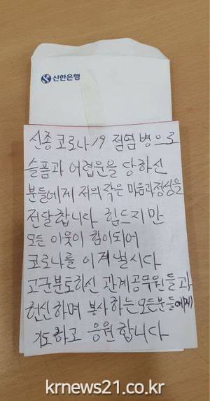 편지에는 “코로나19로 슬픔과 어려움을 당하신 분들에게 저의 작은 정성과 마음을 전달합니다. 힘들지만 모든 이웃이 힘이 되어 코로나19를 이겨냅시다. 고군분투하는 관계 공무원과 헌신하며 봉사하는 모든 분들을 위해 기도하고 응원합니다”라고 적혀 있었다.