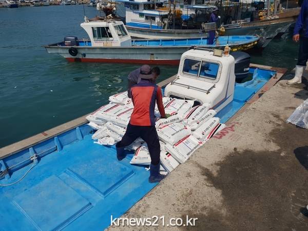 ▲ 여수시(시장 권오봉)가 어류양식어가에 면역증강제를 지원하고 있다.