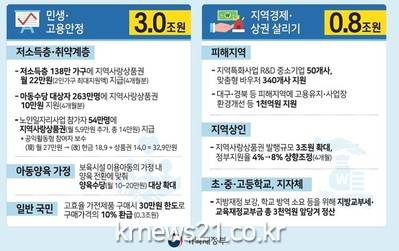 정부는 이번 추경 외에도 지난달 발표한 코로나19 대응 종합 대책에서 정부가 쓰기로 한 재정(세금 감면 포함) 4조8천억원, 금융기관의 대출·보증, 공공기관 투자 등을 합하면 총 31조6천억원이 코로나19 극복에 쓰인다고 강조했다.