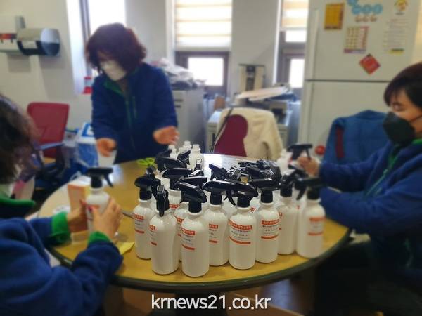 순천시 덕연동 부녀회에서는 코로나19 확산을 차단하고자 염소계소독제 80배를 희석한 용액 500ml 1000개를 만들어 취약계층에 배부했다.