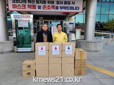 ▲ [사진제공 = 영양군]재안동향우회(회장 권성규)에서는 지난 3월 4일 영양군청을 방문하여 코로나19 확산에 따른 사각지대에 놓인 독거노인, 장애인, 저소득 가정 등 소외계층을 위해 사용해 달라며 400만원 상당의 마스크(500개) 및 손소독제(340개)를 전달해 코로나19 극복에 동참하였다.