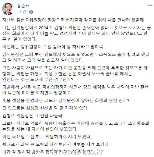 홍 전 대표는 이어 “25년동안 당에 헌신한 저를 모욕과 수모를 주면서 내팽개친다는 것은 정치 이전에 인간이 할 도리가 아니다”라고 덧붙였다.