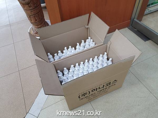 지역 향토기업인 하나코스(대표 최정근)는 지난 3월 9일 둔내면행정복지센터를 방문하여 손소독제 100개를 전달했다.