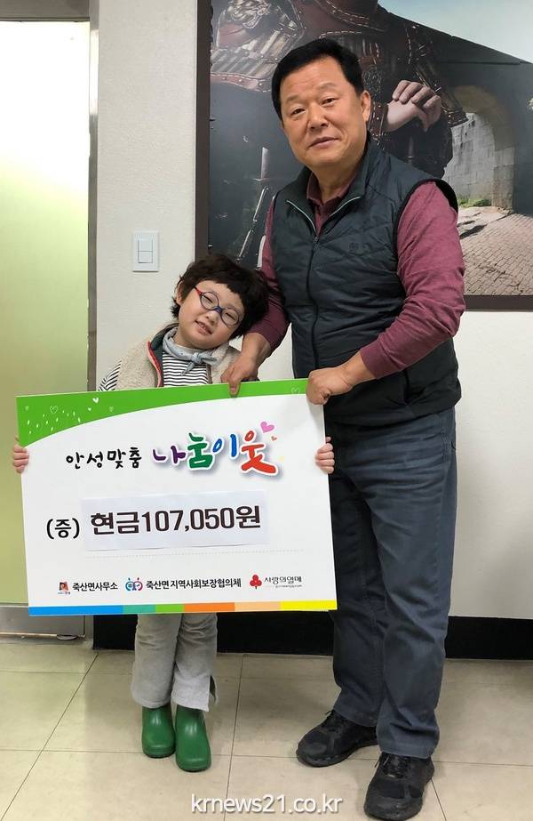 안성시 죽산면에 거주하고 있는 최윤채(7세) 어린이가 지난 9일 코로나19 방역을 위해 써달라며 본인의 저금통을 기탁했다. 면사무소에 따르면 최윤채 어린이가 기탁한 저금통에는 3살부터 4년 동안 모은 107,050원이 들어있었다. 죽산면사무소 직원은 최윤채 어린이로부터 뜻깊은 저금통을 전달 받았다면서 어린친구가 아껴 모은 돈일 텐데 정말 감사하고 대단하다고 전했다. 이날 최윤채 어린이는 4년 동안 꾸준히 모은 돈을 뉴스를 보다 기부하게 됐다면서 코로나19 극복하는데 조금이나마 도움이 됐으면 좋겠다고 말했다. 조현광 죽산면장은 따듯한 어린이의 마음이 코로나19로 고생하고 있는 분들에게 큰 힘이 될 것 이라며 기탁금은 기부 어린이의 뜻에 따라 코로나19 극복을 위해 유용하게 쓸 것 이라고 전했다