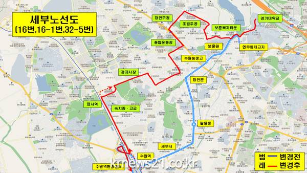 먼저 연무동 차고지에서 멈췄던 16번, 16-1번, 32-5번은 경기대 정문~보훈 복지 타운~조원 주공~장안구청~종합운동장~정자 시장~화서역~숙지중·고교~수원역으로 조정된다. 35번도 노선 조정은 없지만, 정문까지 연장된다.