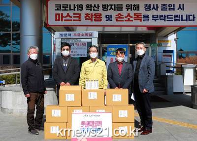 ▲ [사진제공 = 영양군]전국한우협회영양군지부(지부장 정유섭)는 지난 3월 12일 영양군청을 방문하여 100만원의 성금과 300만원 상당의 방역물품(스프레이식 소독제 600개)을 전달하며 코로나19 극복에 동참하였다.