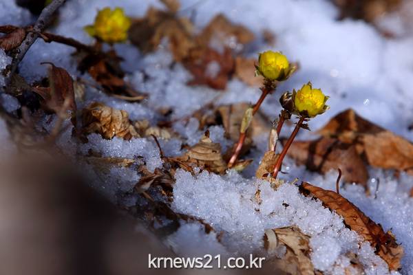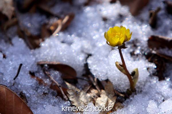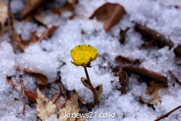 핀 노란 복수초가 활짝 개화하며 인제지역에도 봄을 알리고 있다