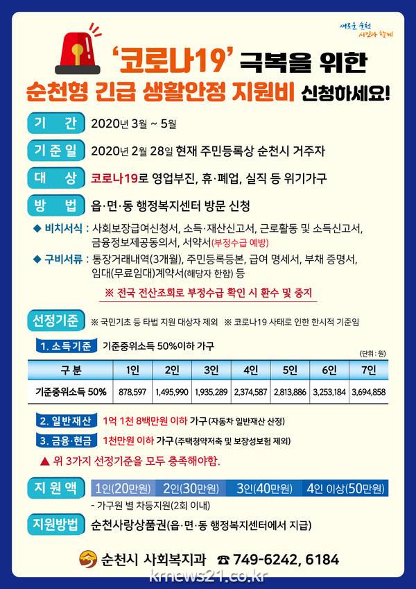 지난 3월 9일부터 신청을 받고 있는 ‘순천형 긴급생활안정지원비’지원대상은 이번 코로나19 여파로 인해 영업부진, 휴․폐업, 실직 등 위기에 처한 가구로 2월 28일 기준으로 주민등록상 순천시 거주자가 해당된다.
