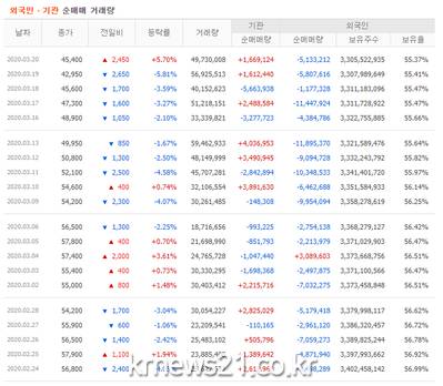 ▲ [이미지 = 삼성전자 순매매 거래량]신종 코로나바이러스 감염증(코로나19) 국내 첫 확진자가 발생한 이후 약 두 달 만에 주요 100개 상장사 시가총액의 3분의 1이 증발한 것으로 나타났다.