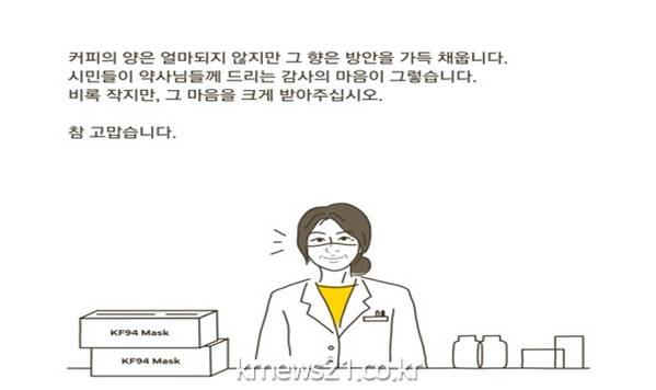하지만 부산시 약사회(회장 변정석)에서는 “시민의 마음이 담긴 커피는 감사히 받겠지만, 마스크는 물량이 부족한 현실을 생각하여 더 어려운 취약계층을 위해 기부할 계획이다.”라고 밝혔다.