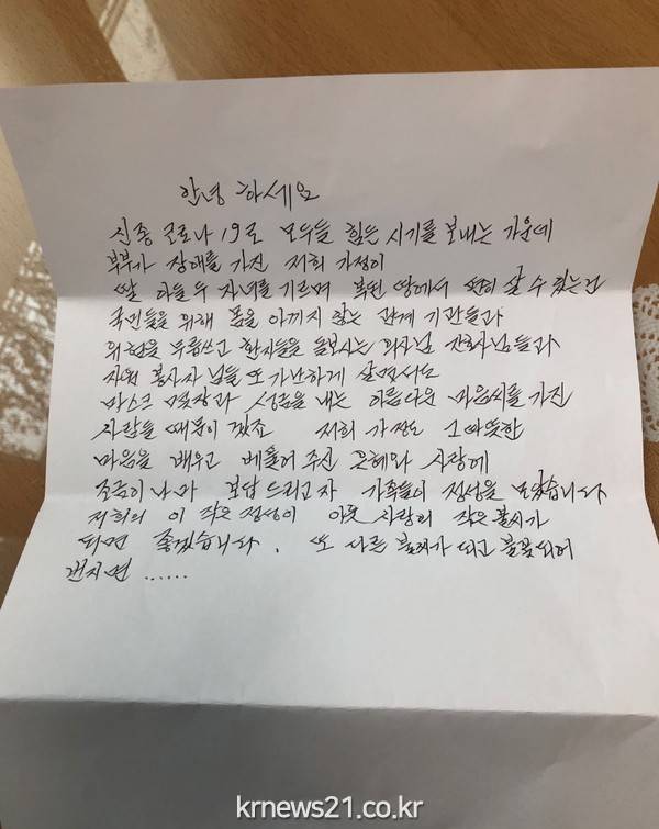 장성동은 23일(월) 동 행정복지센터에 장애를 가진 부부가 편지와 현금, 마스크 20여 매를 전달했다고 밝혔다.
