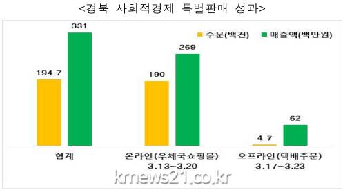 경북도는 지난 13일부터 ‘힘내라! 경상북도, 함께해요~사회적경제’를 슬로건으로 진행된 경북 사회적경제기업 제품 온․오프라인 특별판매 총판매액이 행사 일주일만에 3억원을 달성했다고 밝혔다.