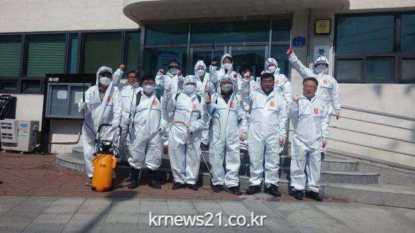 황연동통장협의회(회장 전호규) 통장단과 황연동 직원 등 20여 명이 25일(수) 오후 통리 5일 장터 및 태양의 후예 공원 일원에서 코로나 19 차단을 위한 방역활동을 실시했다.
