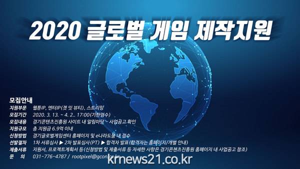경기콘텐츠진흥원이 운영하는 경기 글로벌게임센터에서 3월 23일(월)부터 4월 2일(목)까지 ‘2020 글로벌 게임 제작지원’ 지원기업을 모집한다.