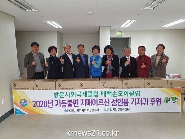 밝은사회국제클럽·태백손모아클럽(회장 박영희) 회원들이 1일(수) 태백시지역사회보장협의체에 성인용 기저귀를 후원했다.