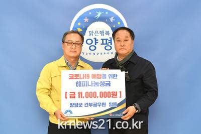 양평군에 근무하고 있는 5급 이상 간부공무원 55명이 코로나19를 예방하고 확진자 없는 양평군을 만들기 위해 1,100만원을 기부하며 노블레스 오블리주를 실천하는 모습을 보여 양평군민 및 후배 공무원들에게 큰 모범이 되고 있다.