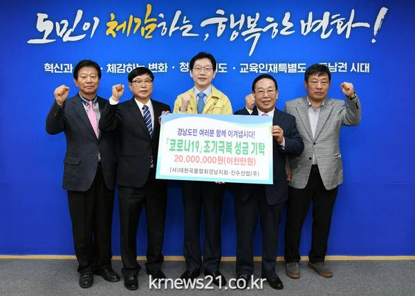 (사)대한곡물협회경남도지회(지회장 김승주)와 진수산업(주)(대표 박영식)이 코로나19 조기 극복을 위해 써 달라며 각 1000만 원씩 총 2000만 원을 경상남도(도지사 김경수)에 4월 3일 전달했다.