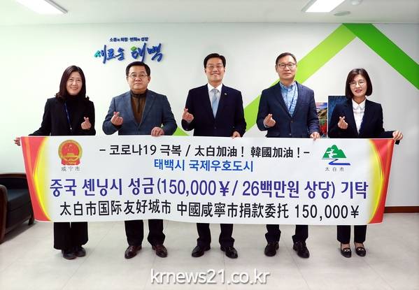 태백시는 시의 국제 우호도시인 중국 셴닝(咸寧)시에서 코로나19 위기극복을 응원하는 마음을 담아 중국인민폐 150,000¥(한화 2,600만 원 상당)을 강원사회복지공동모금회를 통해 보내왔다고 9일 밝혔다.