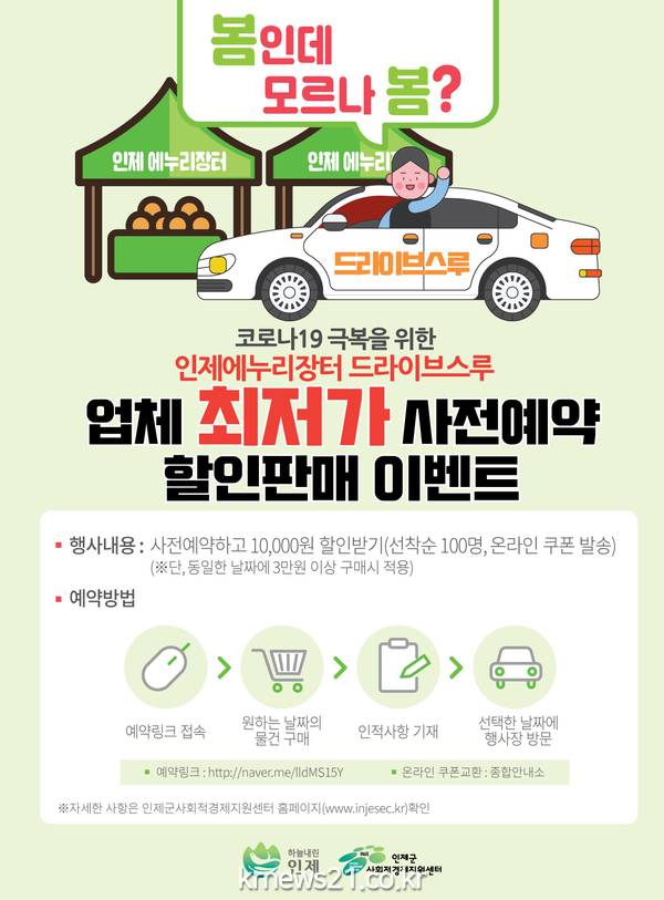 또한 온라인 (SNS, 카카오 채널 등)에서‘인제 에누리장터’로 검색하거나, 이벤트 운영 페이지인 http://naver.me/IIdMS15Y 에 접속, 원하는 물품을 사전에 예약해 구매 할 수 있으며 소비자들은 차에서 내리지 않고 안전하게 온라인으로 사전 예약된 물품을 확인 후 구매하면 된다.