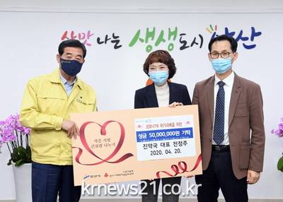 ▲ [사진제공 = 안산시]안산시(시장 윤화섭)는 20일 진약국에서 코로나바이러스감염증-19(코로나19) 위기 극복을 위해 사용해 달라며 성금 5천만 원을 기탁해 위기가정 등을 돕는데 사용하기로 했다.