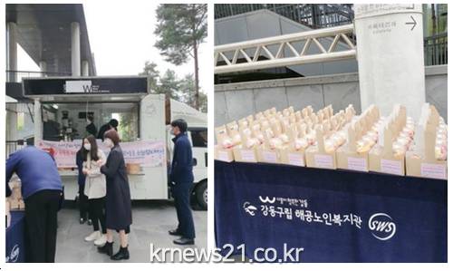 지난 22일 강동구립 해공노인복지관은 ‘사랑의 간식차’로 강동경희대병원 의료진 및 관계자에게 격려의 마음을 담아 따뜻한 커피, 과일, 쿠키 등의 간식을 제공했다.