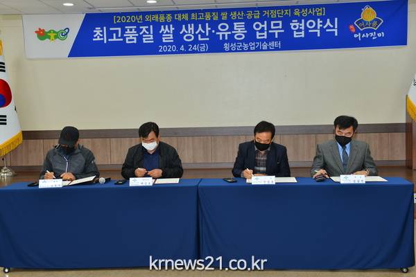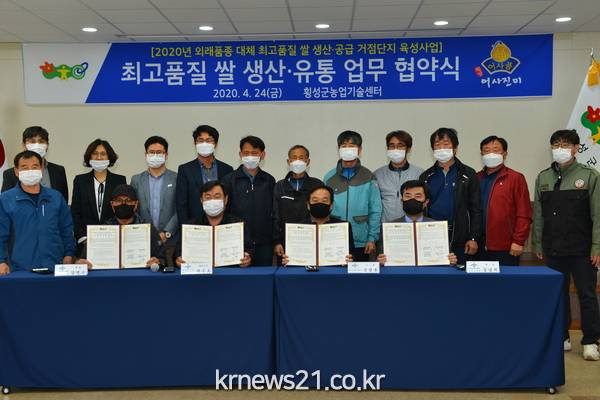 횡성군농업기술센터(소장 신상훈)는 외래품종 대체 최고품질 쌀 생산·공급 거점단지 육성사업의 성공적인 추진을 위해 24(금) 11시 30분에 농업기술센터 교육장에서 협약식을 갖었다.