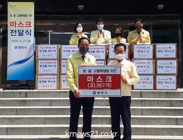 경상북도영천교육지원청(교육장 양재영)은 코로나19로 연기되었던 등교 개학을 대비하여 4. 27.(월) 영천시청(시장 최기문)으로부터 면마스크 및 일회용 마스크 등 코로나19 방역 물품을 지원받아 각급학교에 전달한다.