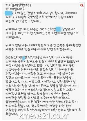 한번 주의를 받았음에도 다시 이어진 부적절한 댓글에 해당 학급 학생의 학부모는 '교육청에 신고해서 반성한다는 답변도 받았는데, 댓글을 전혀 지우지도 않더니 또 이러길래(부적절한 과제를 내주기에) 글을 올렸다'고 재차 게시글을 올렸다.