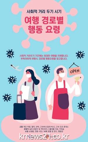 문화체육관광부와 한국관광공사는 29일 발표한 행동 요령은 △이동 수단(자가용, 대중교통, 고속도로 휴게소) △실외 관광지 및 액티비티 △음식점(식당, 커피숍) △쇼핑(쇼핑몰, 전통시장) △숙박시설(호텔, 콘도, 캠핑장 등) 5가지 여행 경로별로 여행자와 사업주가 각각 준수해야 할 안전수칙이다.