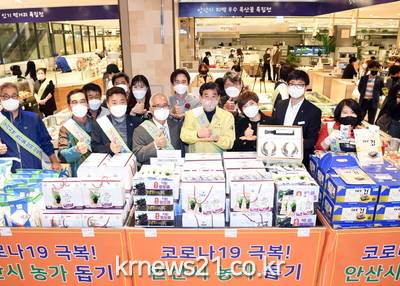 ▲ [사진제공 = 안산시]윤화섭 안산시장이 지난 28일 롯데백화점 안산점에서 열린 ‘코로나19 극복! 안산시 농가 살리기’ 농특산물 특별판매 행사장을 방문해 생산농가들을 격려하고 농민들의 애로사항을 청취했다.