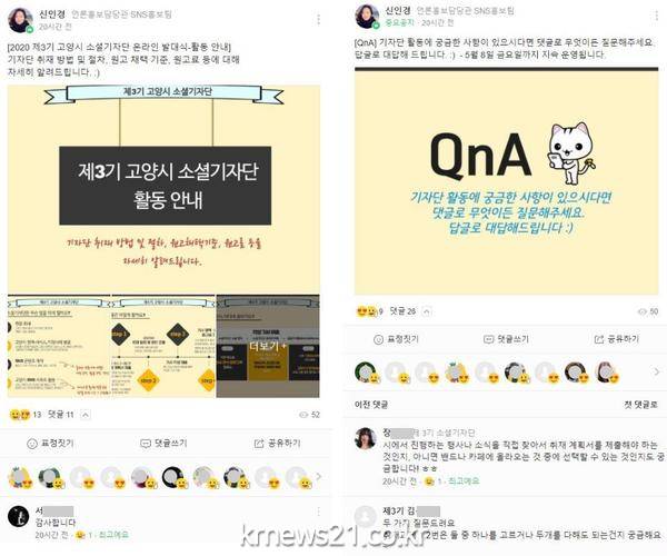이후 기자단 활동 안내, 고양시SNS 소개를 비롯해 실시간 댓글을 통한 소통과 화합의 시간도 이어졌다. 온라인의 장점을 십분 이용해 활동에 대한 궁금증을 해소하는 질의응답 기간은 오는 8일(금)까지 운영한다.