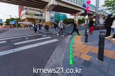 광진구(구청장 김선갑)가 횡단보도 이용 시 스마트폰 등을 사용하는 보행자의 안전을 위해 지역 내 횡단보도에 ‘LED 바닥 신호등’과 ‘보행신호 음성 안내기’를 설치했다.