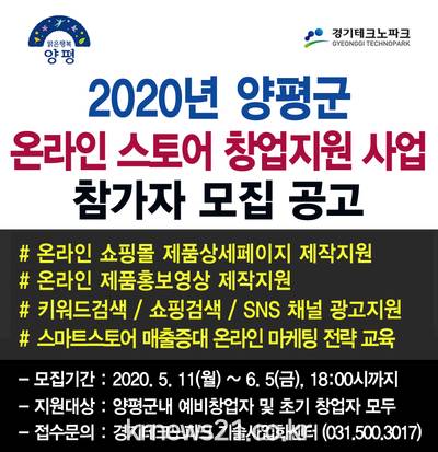 지원대상은 양평군에서 쇼핑몰(스마트스토어) 창업을 희망하는 온라인 창업가 및 기창업자이다. 특히 양평군의 청년(18세~39세) 중 예비창업자 및 기창업자를 우선 선정한다. 신청기간은 6월 5일(금) 18시까지이다.