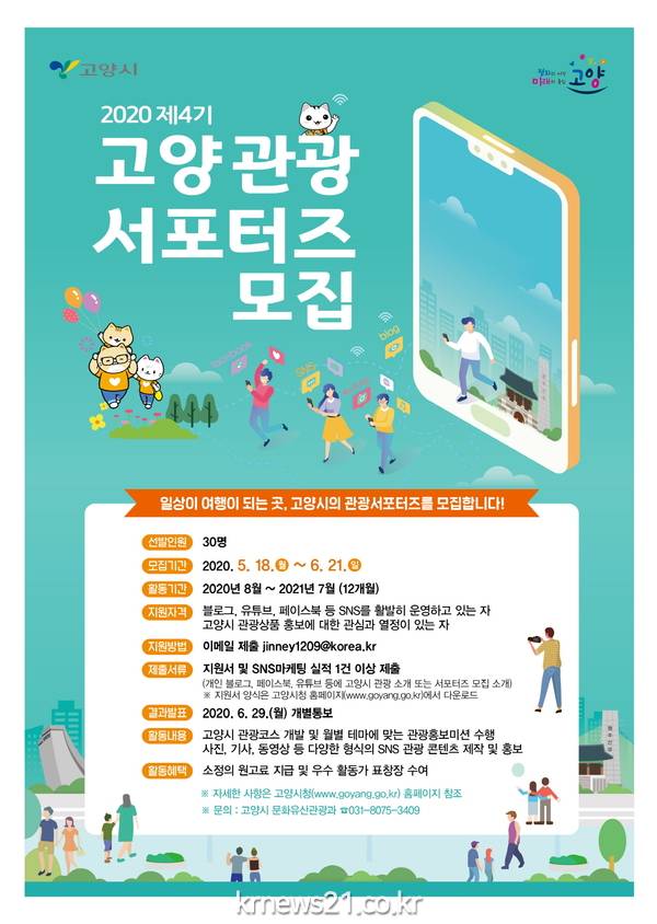 이번에 모집하는 ‘제4기 고양 관광서포터즈’는 2020년 8월부터 1년 간 고양시 도보관광코스를 개발하고 개인 소셜 미디어에 홍보하는 임무를 맡는다. 아울러 소정의 원고료가 지급되며 역량 개발을 위한 교육 참여의 기회도 주어진다.