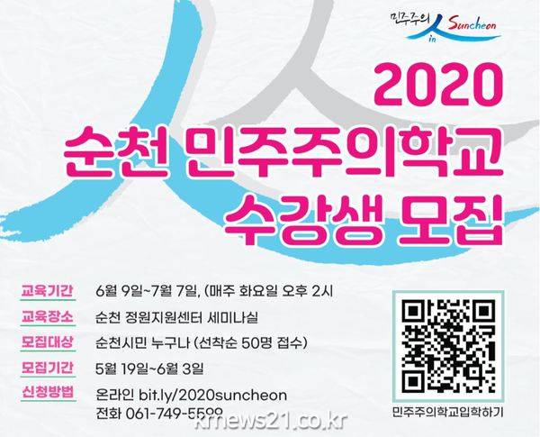순천시(시장 허석)는 5월 19일부터 6월 3일까지 ‘순천 민주주의 학교’ 첫 입학생 50명을 선착순 모집한다고 밝혔다.
