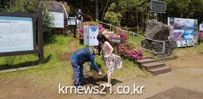 ▲ [사진제공 = 제주시]제주시 동부보건소는 주민 및 관광객 방문이 많은 주요 등산로에 진드기기피제 자동분사기를 설치하여 진드기 매개 감염병 발생 차단에 힘쓰고 있다.